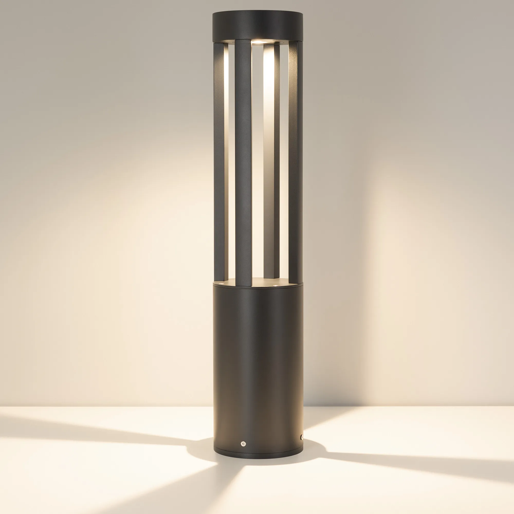 Уличный светодиодный светильник для подсветки дорожек с изменяемой цветовой температурой. Мощность 20 Вт, св. поток 1200-1400 лм, 60-70 лм/Вт, теплый 3000 K, теплый 3500 K, дневной 4000K, CRI>80, угол 80°, напряжение питания 230 В. Темно-серый круглый корпус из алюминия RAL7016, экран из закаленного стекла, степень защиты IP65. Размер: диаметр 160 мм, высота 800 мм. Монтаж накладной, комплект крепежа поставляется со светильником. Драйвер 27-40 В, 500 мА, пульсация <1%.