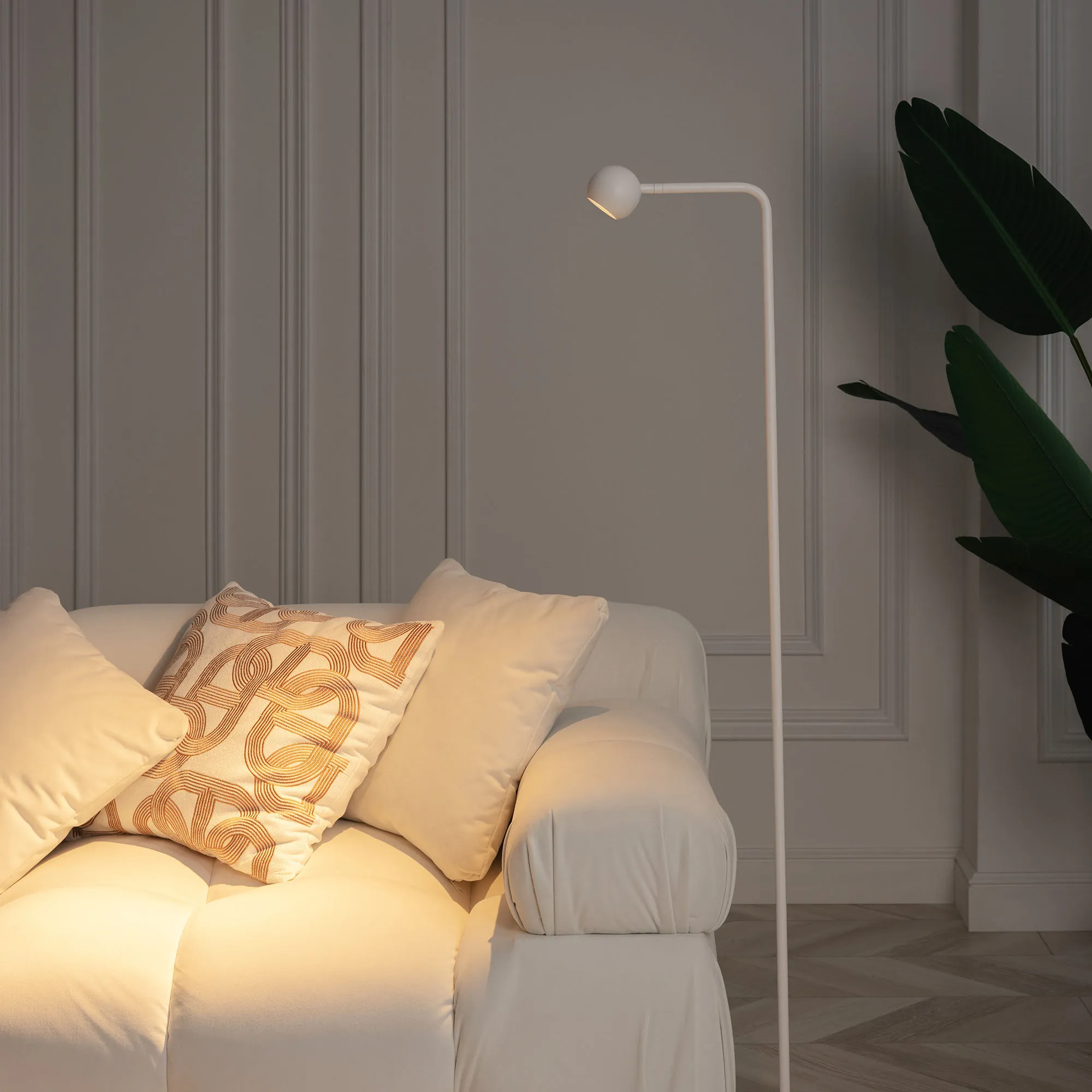 Декоративный напольный светильник. Мощность 6 Вт, св. поток 540 лм, 90 лм/Вт, теплый 3000К, CRI>90, угол 30°, напряжение питания 230 В. Белый корпус из алюминия (основание, ножка, светоизлучаль в форме шара), степень защиты IP20. Размер основания Ø210×11 мм, размер ножки Ø12,5×1220х160 мм, размер светоизлучателя Ø65×55,5 мм. Длина провода 1930 мм, питание от сети 220-240V. Пульсация < 1%