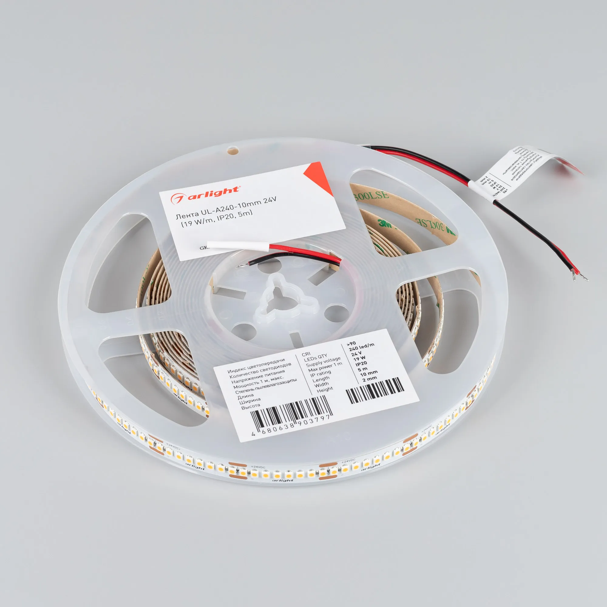 Светодиодная лента UL серии A240. Светодиоды SMD 2835, 240 шт/м, белая плата шириной 10 мм, скотч 3M. Цвет ТЕПЛЫЙ 3000K, индекс цветопередачи CRI>90, угол 120°. Питание 24 В, мощность 19 Вт/м (95 Вт на 5 м). Размеры 5000x10x2 мм. Мин.отрезок 33.33 мм, 8 светодиодов. Цена за 1 м. Обязательная установка на профиль.