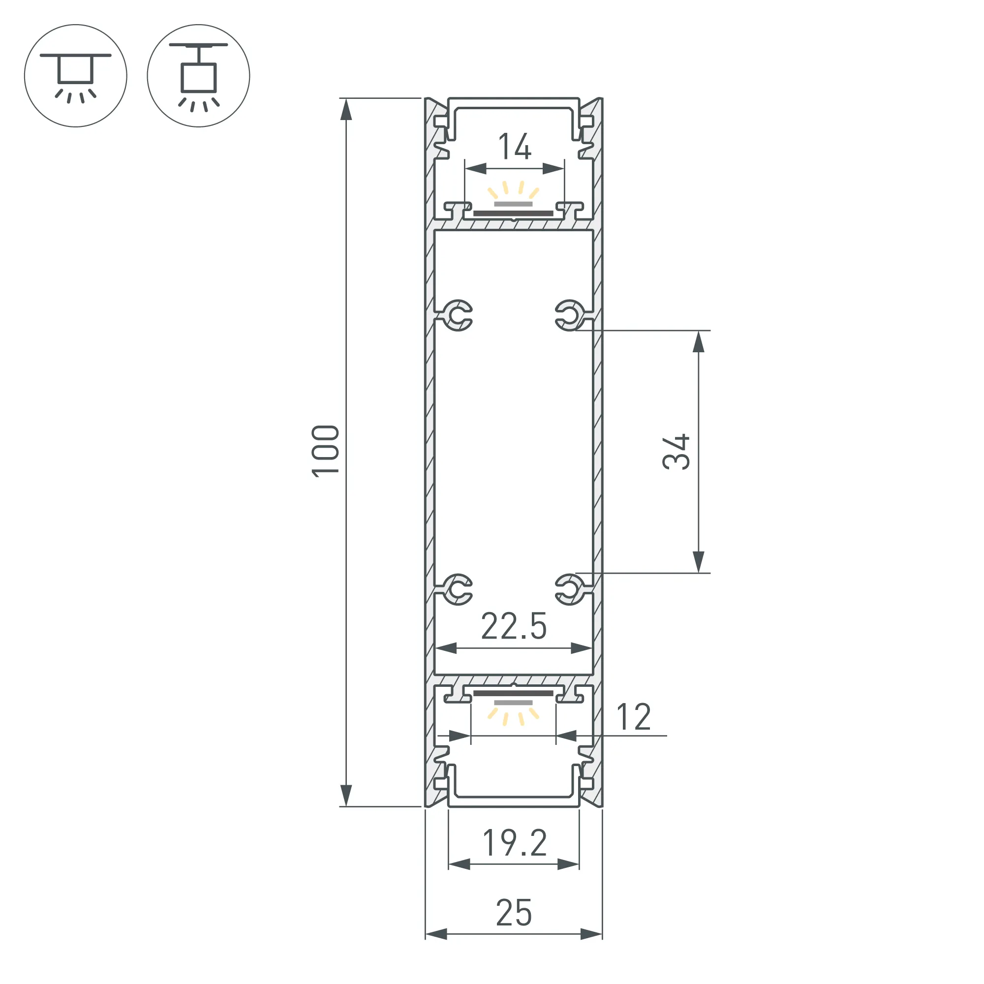 Под заказ от 100 м. Алюминиевый профиль для светодиодных лент и линеек, свечение вверх и вниз. Цвет - оранжевый RAL2008 (порошковая окраска). Габаритные размеры (L×W×H): 2500x25x100 мм. Ширина площадки для ленты 12 мм. Экраны, заглушки и другие аксессуары приобретаются отдельно. Цена за 1 метр.