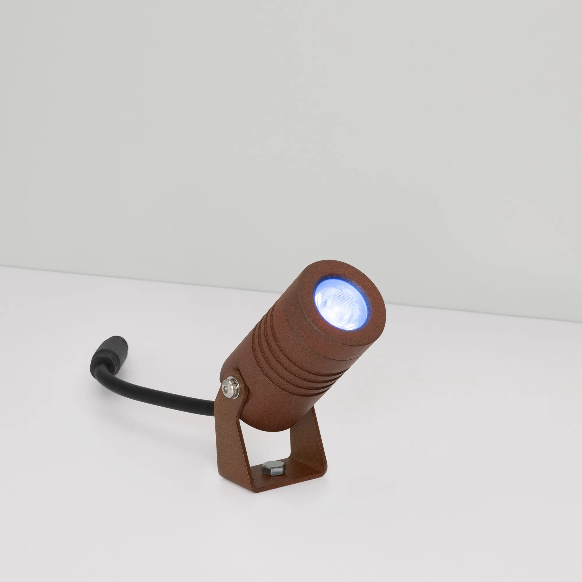 Уличный светодиодный прожектор, мощность 6Вт, угол освещения 25°. Цвет свечения RGB, световой поток 200лм. Влагозащищенный корпус IP67 - цвет кортен - алюминий, экран из закаленного стекла. Угол поворота корпуса в вертикальной плоскости 135°. Питание DC12В, мощность 6Вт. Размеры DxH - Ø42x75мм. В комплекте 1м провод.