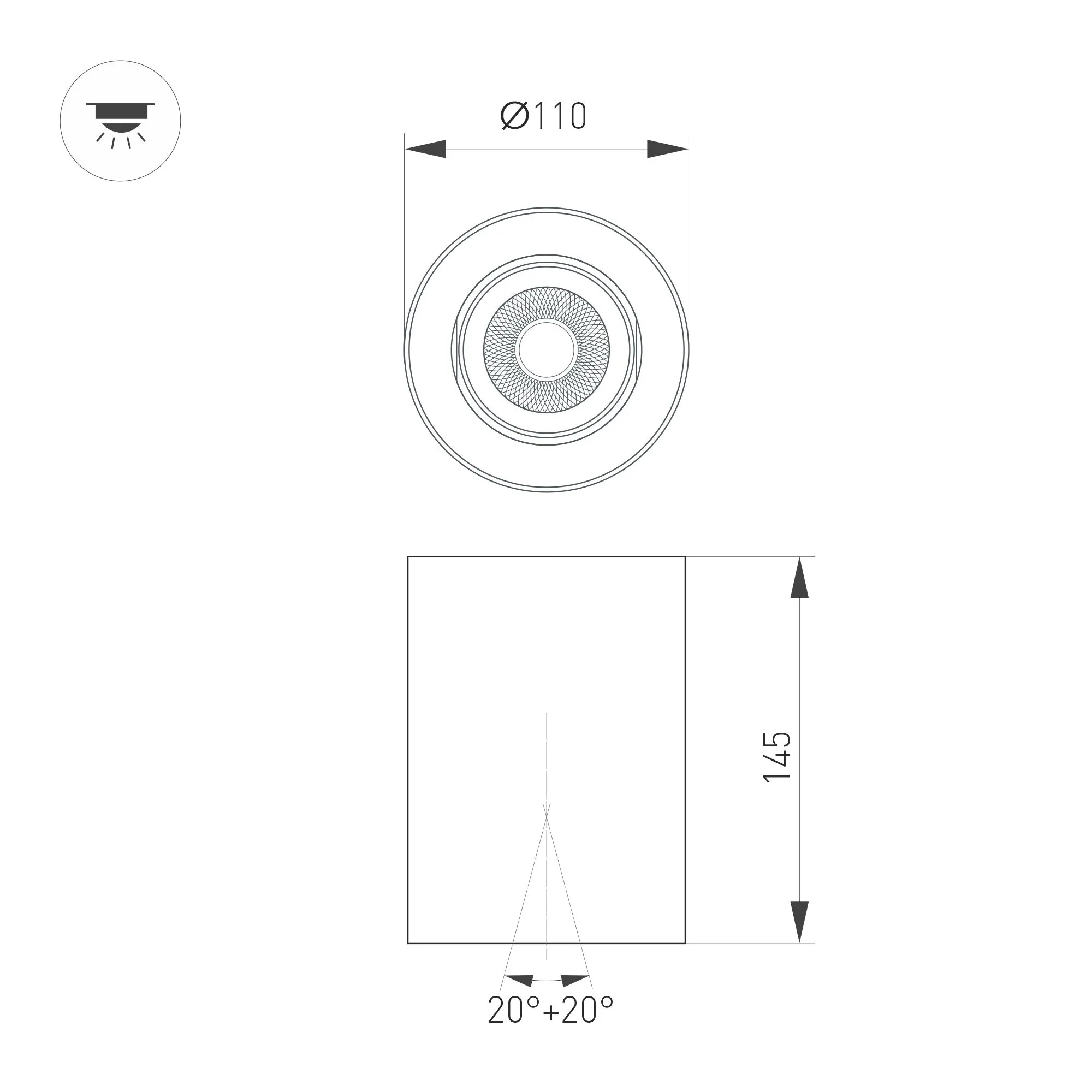 Накладной интерьерный светильник. Мощность 18 Вт, св. поток 1700 лм, 99 лм/Вт, теплый 3000 K, CRI>90, угол 24°, регулируемое направление луча 40°(20+20), поворотный световой модуль вокруг своей оси на 340°, UGR <11, напряжение питания 230 В. Чёрный круглый корпус из алюминия, степень защиты IP54. Размер: диаметр 110 мм, высота 145 мм. Монтаж накладной. Драйвер 27-43 В, 450 мА, пульсация <1%.