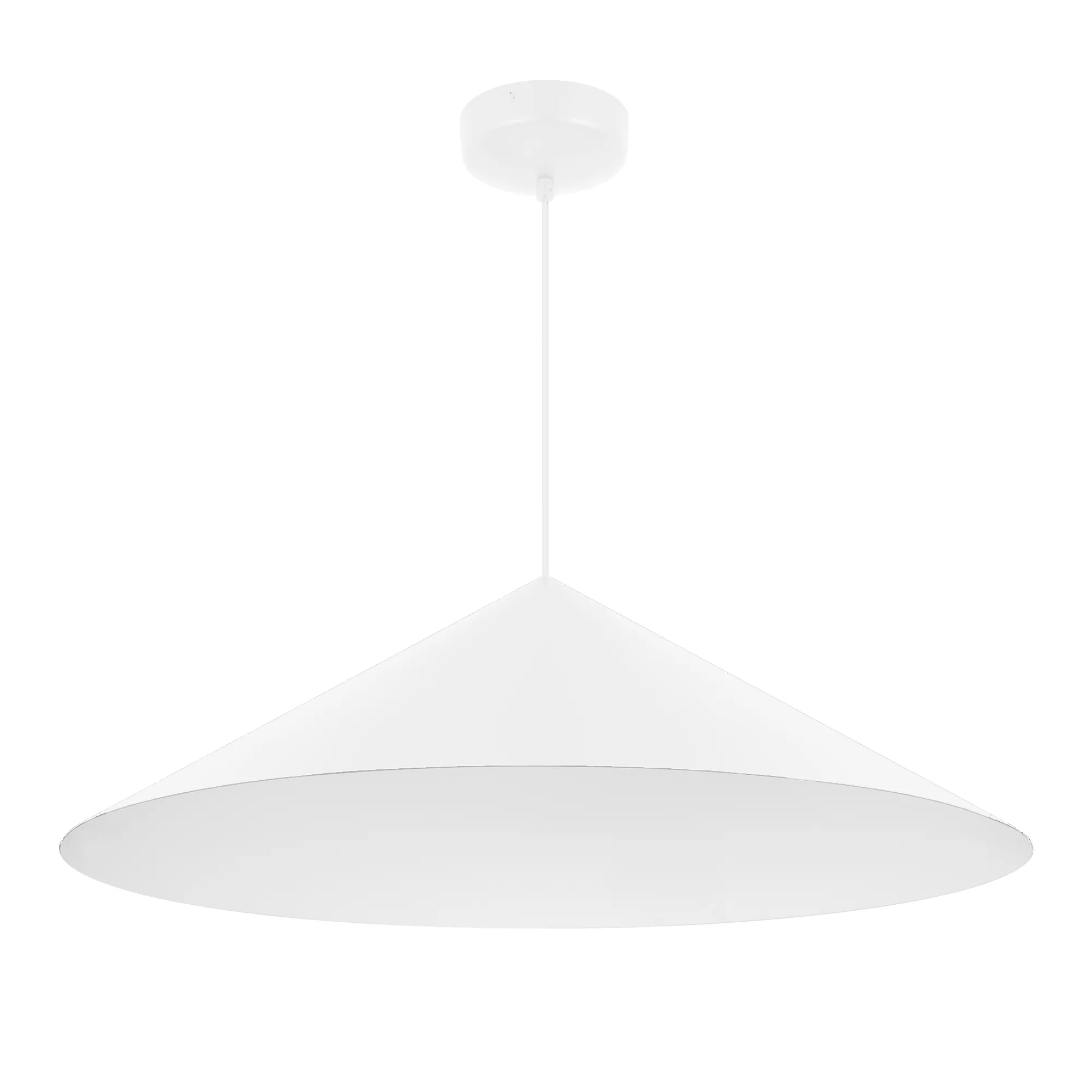 Подвесной светильник. Мощность 14 Вт, св. поток 1200 лм, 90 лм/Вт, теплый 2700K, CRI>97, угол 36°, напряжение питания 230 В. Белый корпус из алюминия в форме конуса с белой внутренней поверхностью, линза-рассеиватель из PMMA, степень защиты IP20. Размер: диаметр 750 мм, высота 230 мм. Монтаж подвесной, длина подвеса 2000 мм, регулируемая. В комплекте 2 вида чаш. Габариты встраиваемой чаши: Ø 80x23 мм. Габариты накладной чаши Ø140x55 мм. Драйвер 27-42 В, 350 мА, пульсация <1%. Управление по TRIAC.