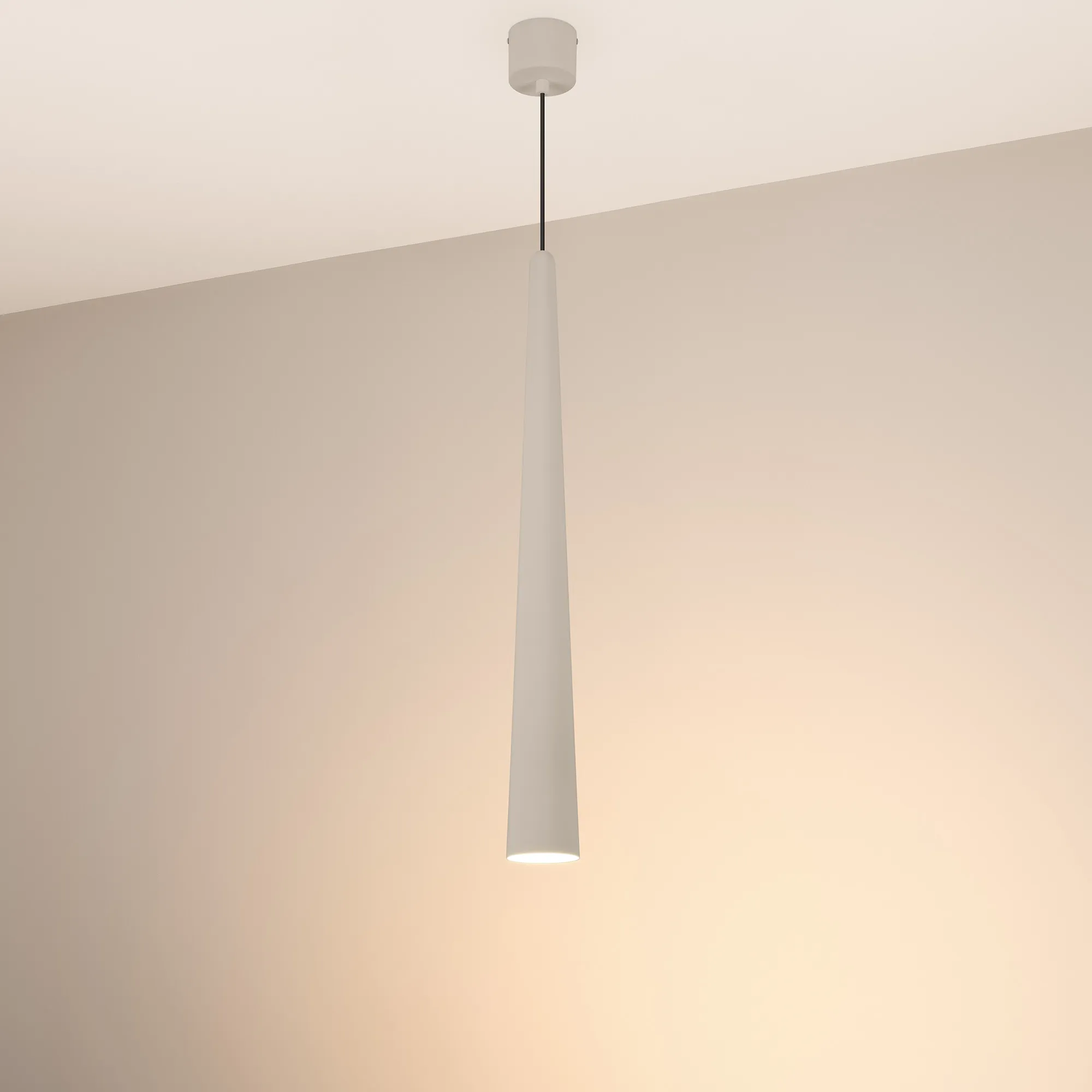 Подвесной светильник. Мощность 5 Вт, св. поток 400 лм, 70 лм/Вт, теплый 2700 K, CRI>92, угол 36°, напряжение питания 230 В. Светло-серый конусообразный вытянутый корпус из алюминия, линза из PMMA, степень защиты IP20. Размер: диаметр 76 мм, высота 670 мм. Монтаж подвесной, длина подвеса 2000 мм, регулируемая. В комплекте 2 вида чаш. Габариты встраиваемой чаши: Ø 80x41 мм. Габариты накладной чаши Ø80x60 мм. Драйвер 2,8-12В, 500 мА, пульсация <1%.