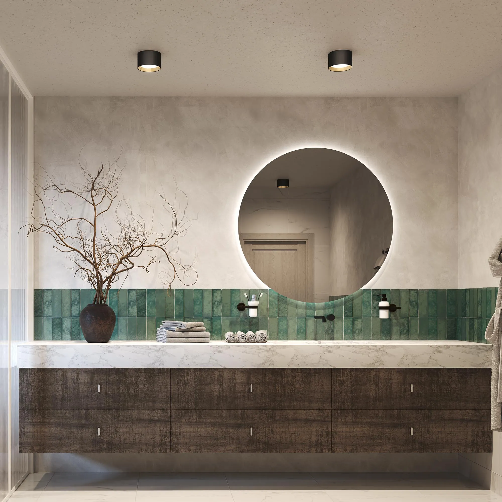 Накладной светильник. Мощность 8 Вт, св. поток 620-640 лм, 80-85 лм/Вт, теплый 2700 K, теплый 3300K, дневной 4000K (переключается), CRI>90, угол 80°, напряжение питания 230 В. Черный круглый корпус из алюминия с золотой вставкой, экран PC, степень защиты IP54. Размер: диаметр 90 мм, высота 75 мм. Монтаж накладной. Драйвер 27-43 В, 200 мА, пульсация < 2 %.