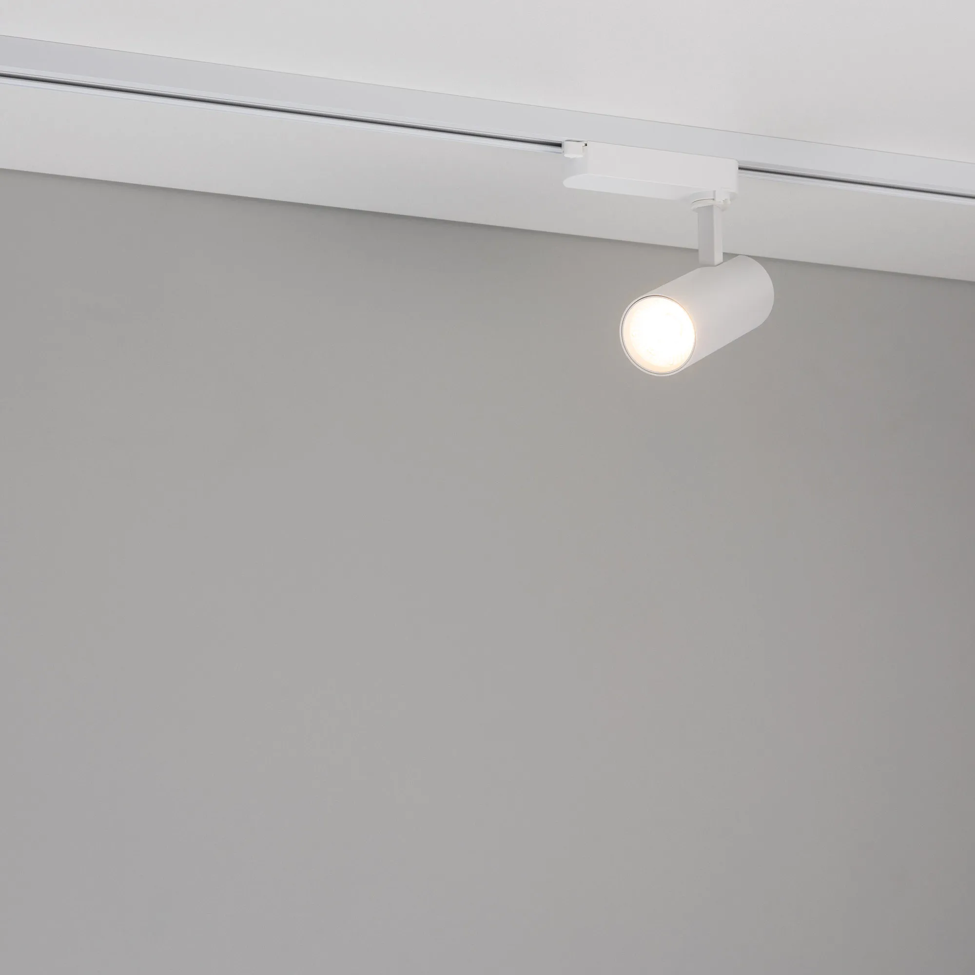 Светильник для треков/шин 2 провода. Мощность 10 Вт, св. поток без решетки honeycomb 1000 лм, 100 лм/Вт, с решеткой honeycomb 660 лм, 66 лм/Вт, теплый 3000 K, CRI>90, угол 55°, напряжение питания 230 В. Белый круглый корпус из алюминия, материал линзы PMMA, степень защиты IP20. Размер: диаметр 55 мм, длина световой части 141 мм. Монтаж на трек 1-фазный. Драйвер встроенный 25-40 В, 250мА., пульсация <5%.