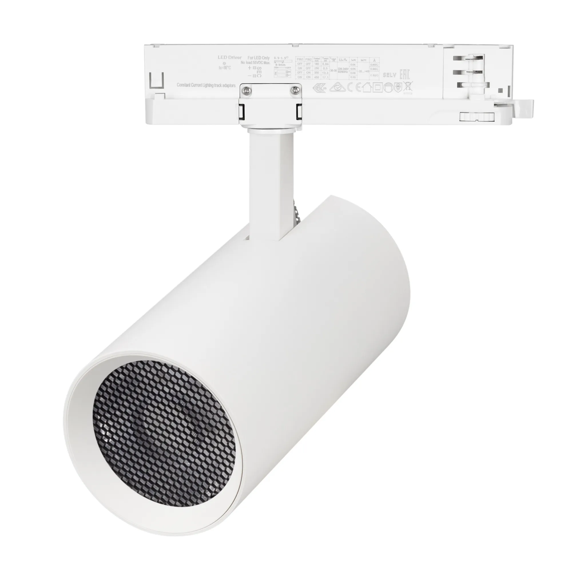 Светильник для треков/шин 4 провода. Мощность 40Вт, св. поток без решетки honeycomb 4000 лм, 100 лм/Вт, с решеткой honeycomb 2640 лм, 66 лм/Вт, теплый 3000 K, CRI>90, угол 55°, напряжение питания 230 В. Белый круглый корпус из алюминия, материал линзы PMMA, степень защиты IP20. Размер: диаметр 90 мм, длина световой части 141 мм. Монтаж на трек 3-фазный. Драйвер встроенный 24-42 В, 750мА., пульсация <5%