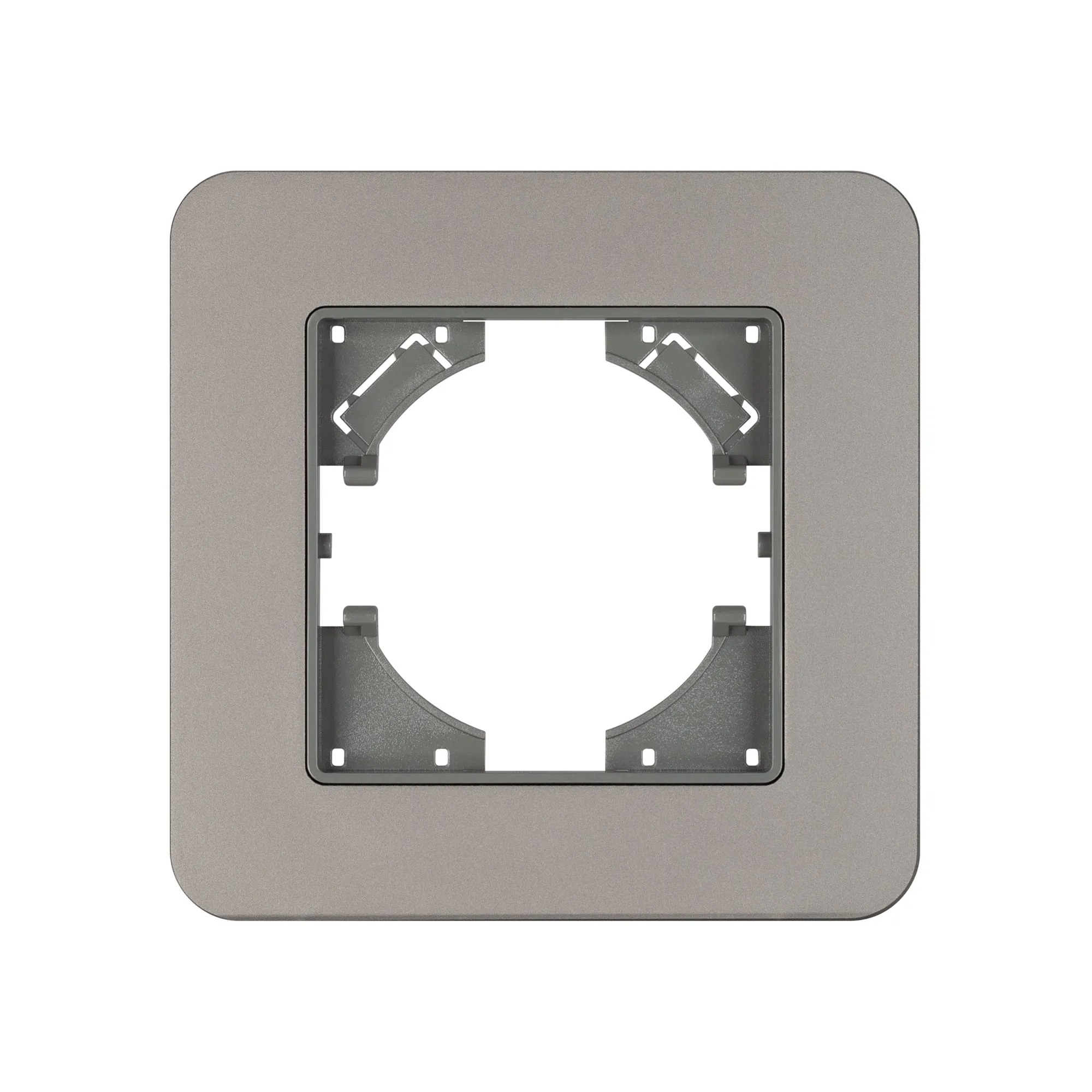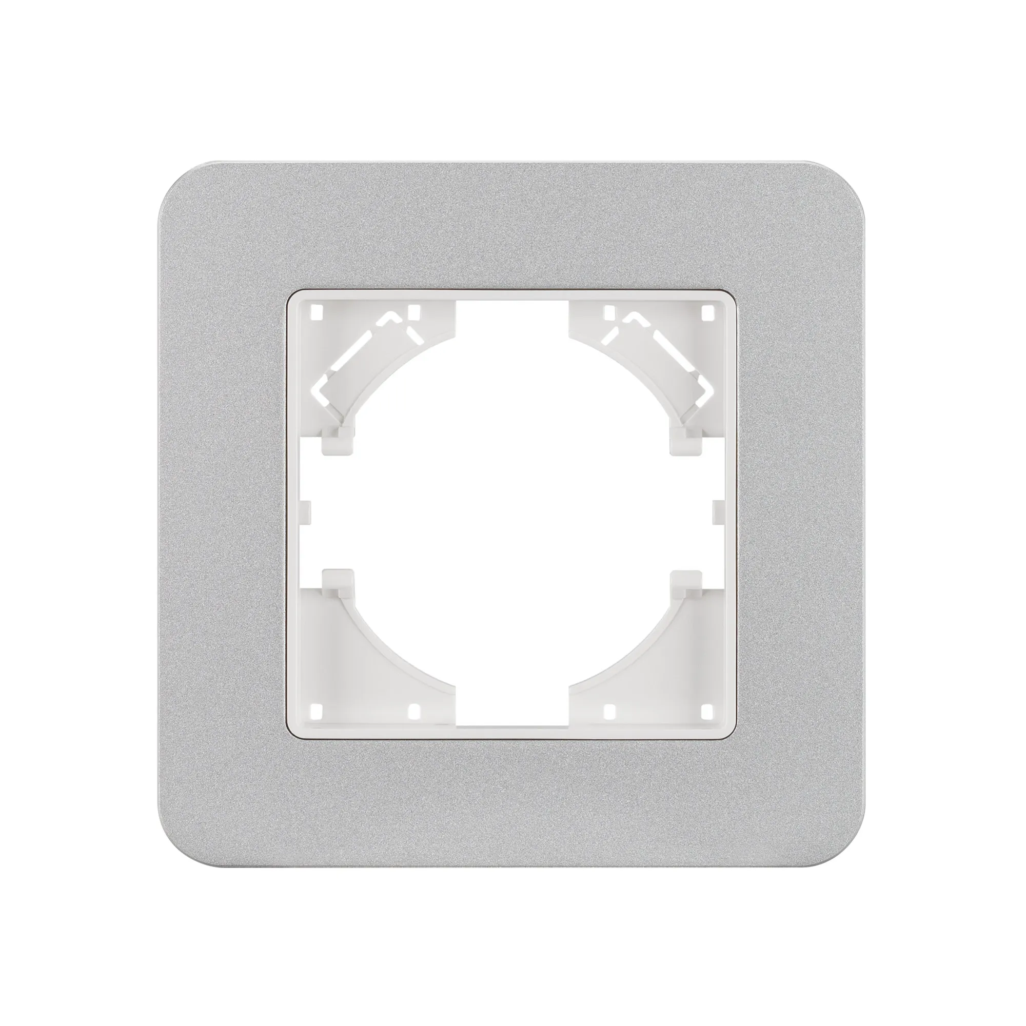 Рамка алюминиевая на 1 пост, под встраиваемый механизм. Цвет - серебристый с Soft-Touch покрытием. Уровень герметичности IP20. Ориентация монтажа - горизонтальная (основным ориентиром служат посадочные выступы для накладки механизма).