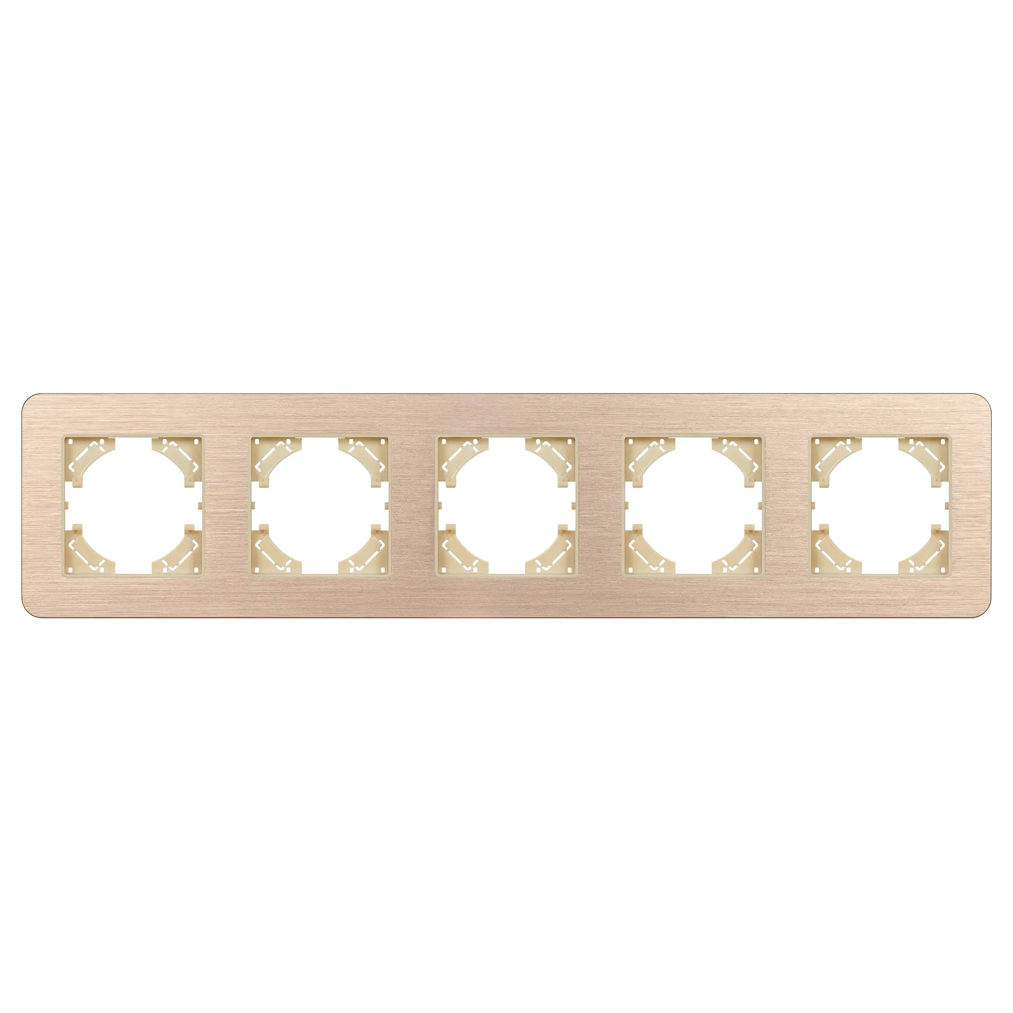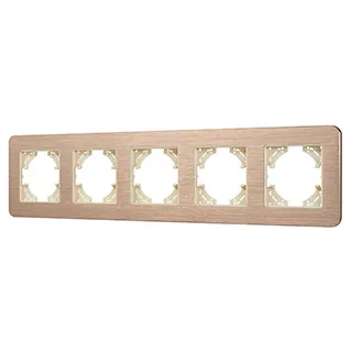 Рамка алюминиевая на 5 постов, под встраиваемый механизм. Цвет - золотой. Уровень герметичности IP20. Ориентация монтажа - горизонтальная (основным ориентиром служат посадочные выступы для накладки механизма).