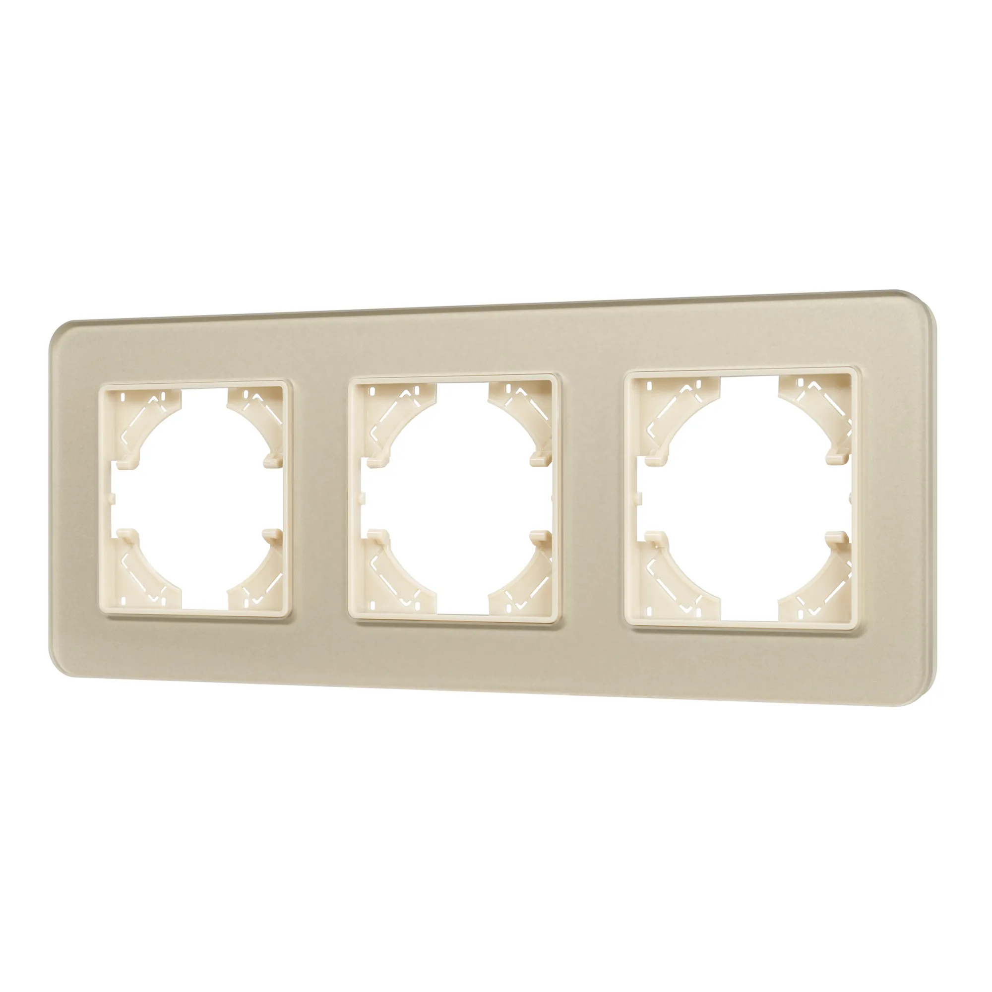 Рамка стеклянная на 3 поста, под встраиваемый механизм. Цвет - золотой с Soft-Touch покрытием. Уровень герметичности IP20. Ориентация монтажа - горизонтальная (основным ориентиром служат посадочные выступы для накладки механизма).