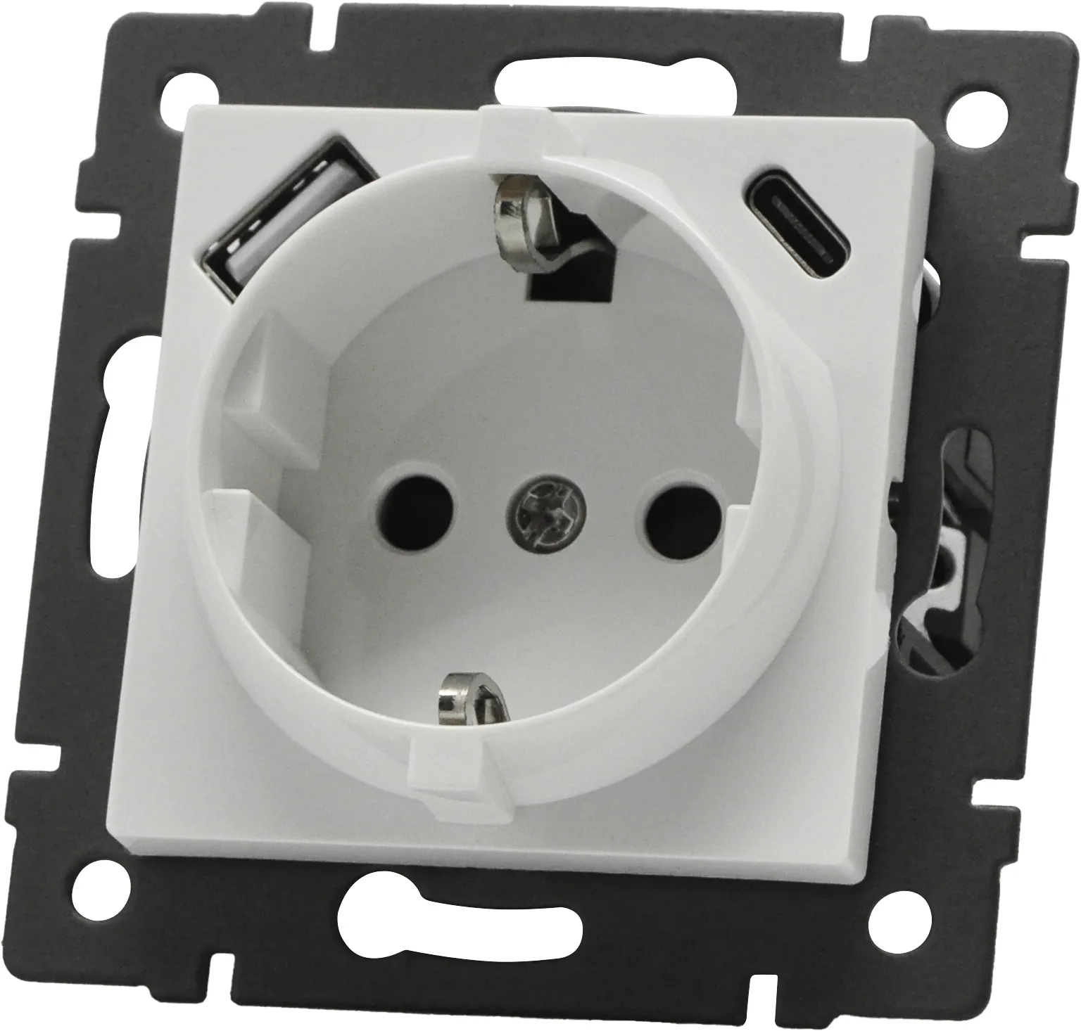 Механизм розетки с заземлением 1 пост 2 USB Type A+C порта. Цвет - белый. Без фронтальной рамки. Уровень пылевлагозащиты IP20. Устанавливается в стандартный подрозетник.