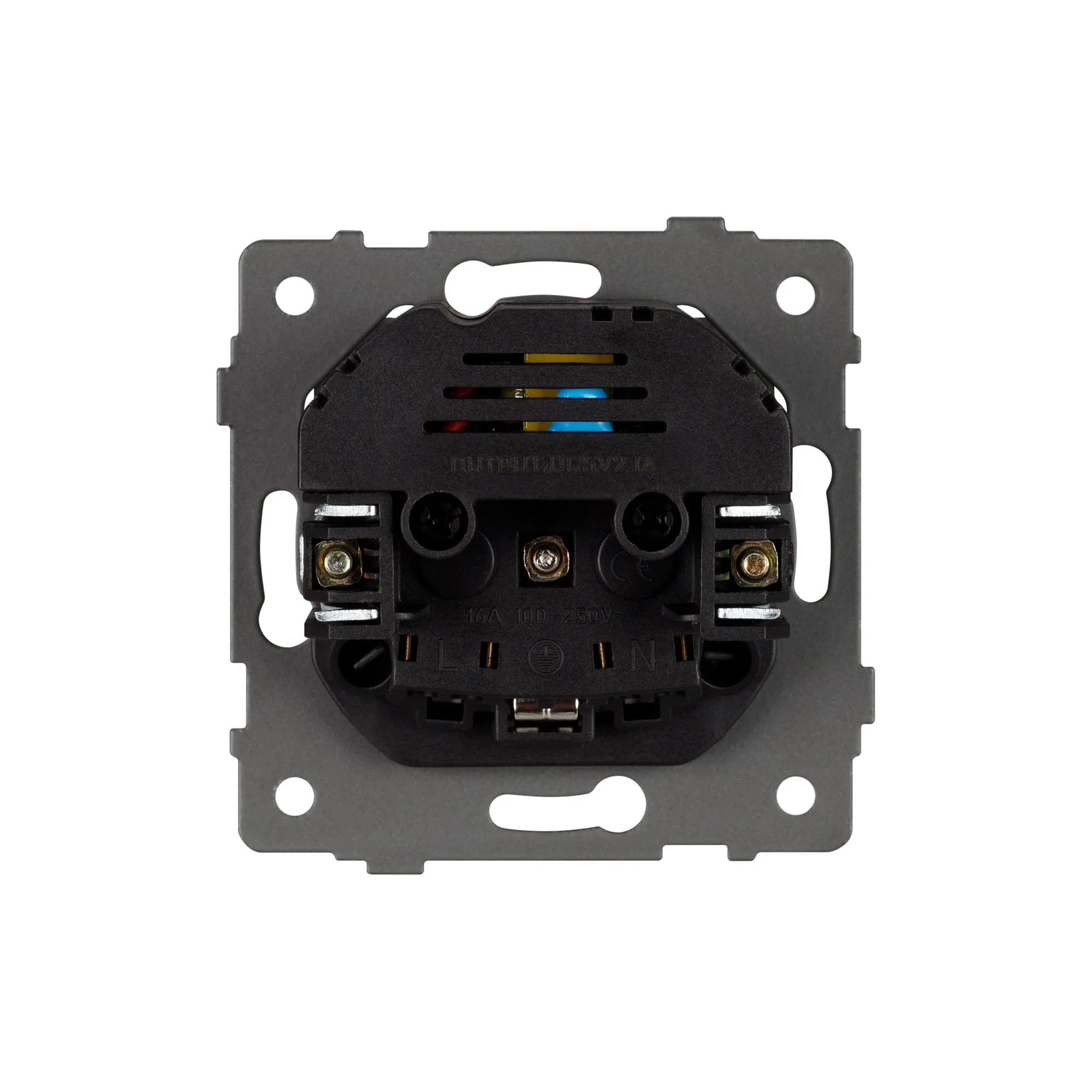 Механизм розетки с заземлением на 1 пост и 2USB Type A порта. Цвет - золотой. Без фронтальной рамки. Среднего уровня герметичности IP20. Устанавливается в стандартный подрозетник.
