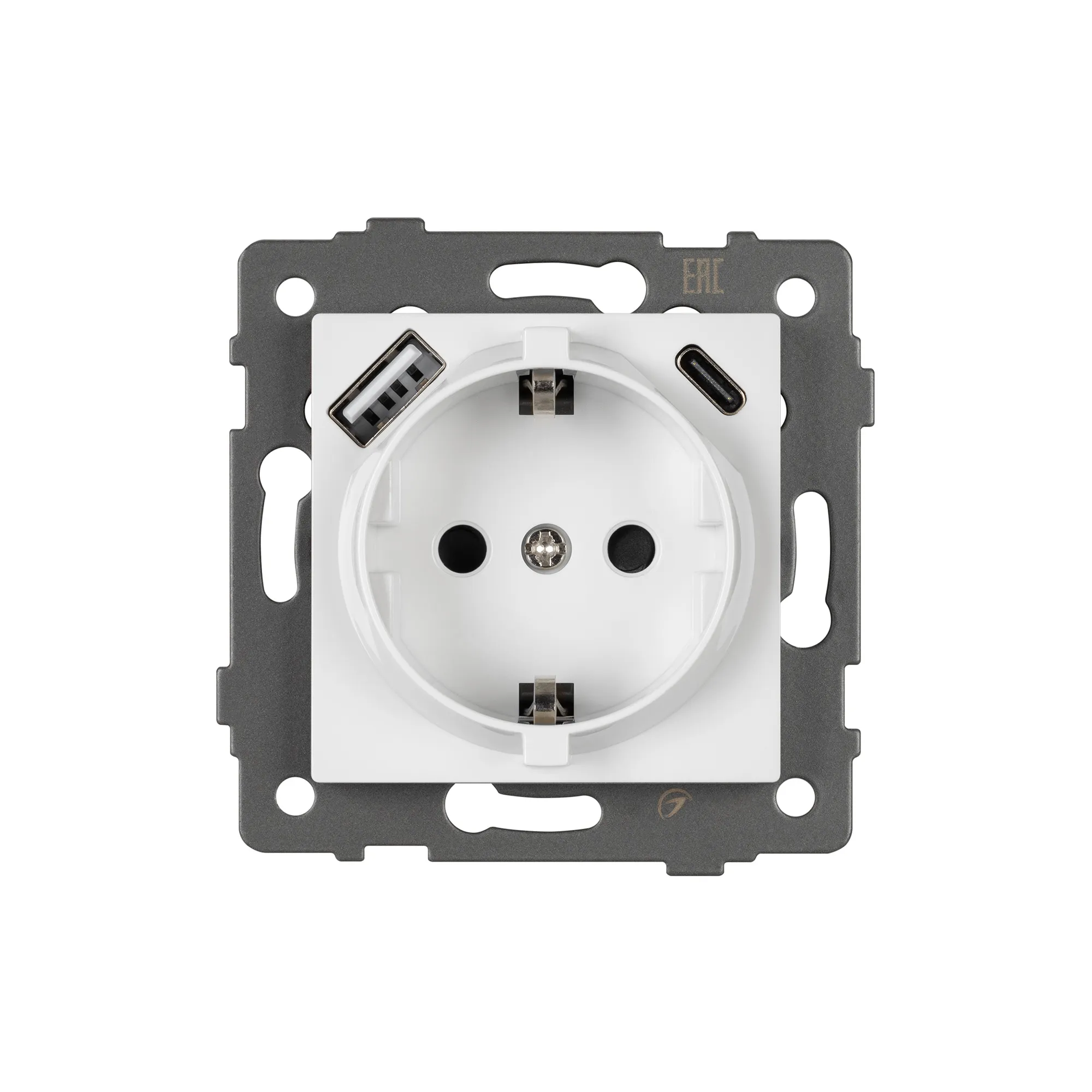 Механизм розетки с заземлением на 1 пост и 2USB Type A порта. Цвет - белый. Без фронтальной рамки. Уровень пылевлагозащиты IP20. Устанавливается в стандартный подрозетник.