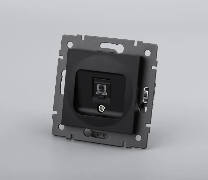 Механизм компьютерной розетки на 1 пост 6-й категории. Цвет - черный. Без фронтальной рамки. Уровень пылевлагозащиты IP20. Тип подключаемого разъема - RJ45. Розетка устанавливается в стандартный круглый подрозетник.