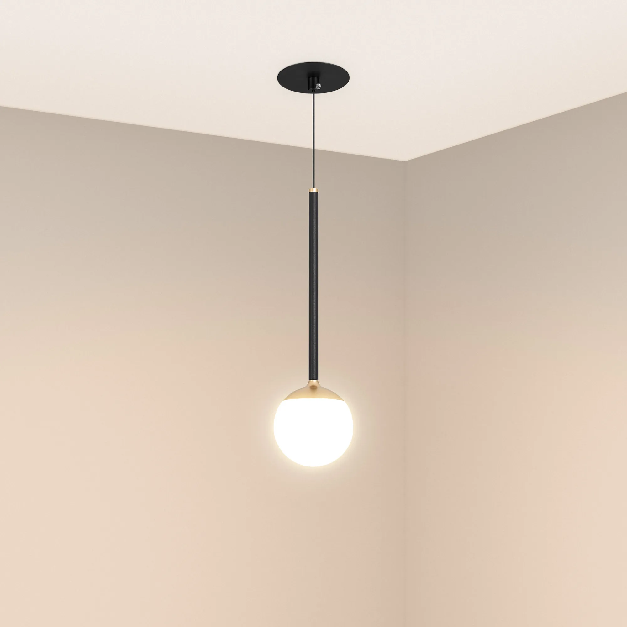 Встраиваемый подвесной светильник. Мощность 8 Вт, св. поток 620 лм, 80 лм/Вт, теплый 3000 K, CRI>90, угол 180°, напряжение питания 230 В. Черно-золотой круглый корпус из алюминия и стали, рассеиватель акрил, степень защиты IP20. Размер: диаметр 100 мм, высота ножки 244 мм, длина подвеса 1150 мм. Размеры чаши Ø92x50 мм, размер врезного отверстия Ø 82 мм. Диаметр провода Ø 4 мм. Монтаж встраиваемый. Драйвер 13-24 В, 300 мА, пульсация <1%.