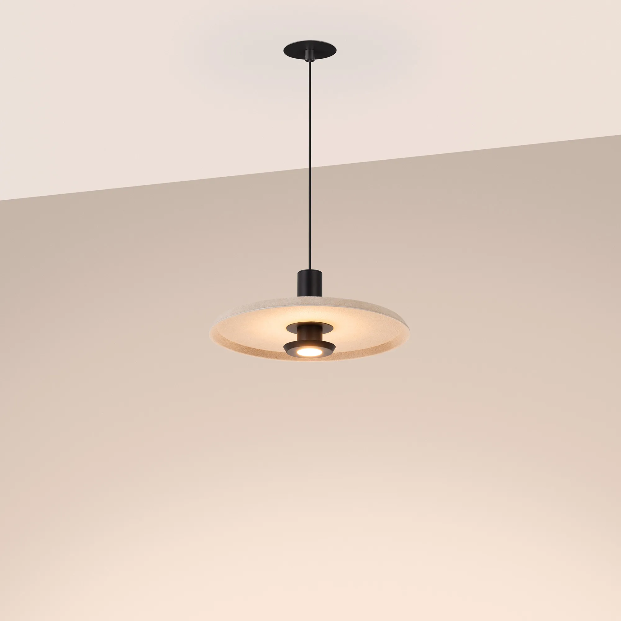 Подвесной светильник. Мощность 12 Вт, св. поток 597 лм, 49 лм/Вт, теплый 2700 K, CRI>94, угол 36°, напряжение питания 230 В. Бежевый фигурный корпус из переработанного фетра с бежевой внутренней поверхностью, линза-рассеиватель из PMMA, степень защиты IP20. Размер: диаметр 350 мм, высота 145 мм. Монтаж подвесной, длина подвеса 2000 мм, регулируемая. В комплекте 2 вида чаш. Габариты чаши (встраиваемая) Ø80 х 23 мм, врезное отверстие Ø60 мм. Габариты чаши (накладная) Ø120 x 35 мм. Драйвер 59 В, 300 мА, пульсация <1%. Управление по TRIAC.