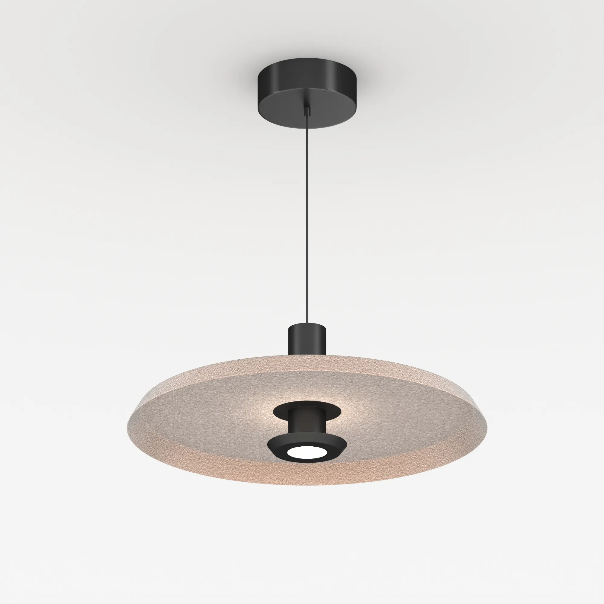 Подвесной светильник. Мощность 12 Вт, св. поток 648 лм, 54 лм/Вт, теплый 2700 K, CRI>94, угол 36°, напряжение питания 230 В. Бежевый фигурный плафон из переработанного фетра с кофейной внутренней поверхностью, линза-рассеиватель из PMMA, степень защиты IP20. Размер: диаметр 450 мм, высота 145 мм. Монтаж подвесной, длина подвеса 2000 мм, регулируемая. В комплекте 2 вида чаш. Габариты чаши (встраиваемая) Ø80 х 23 мм, врезное отверстие Ø60 мм. Габариты чаши (накладная) Ø120 x 35 мм. Драйвер 59В, 300 мА, пульсация <1%. Управление по TRIAC.