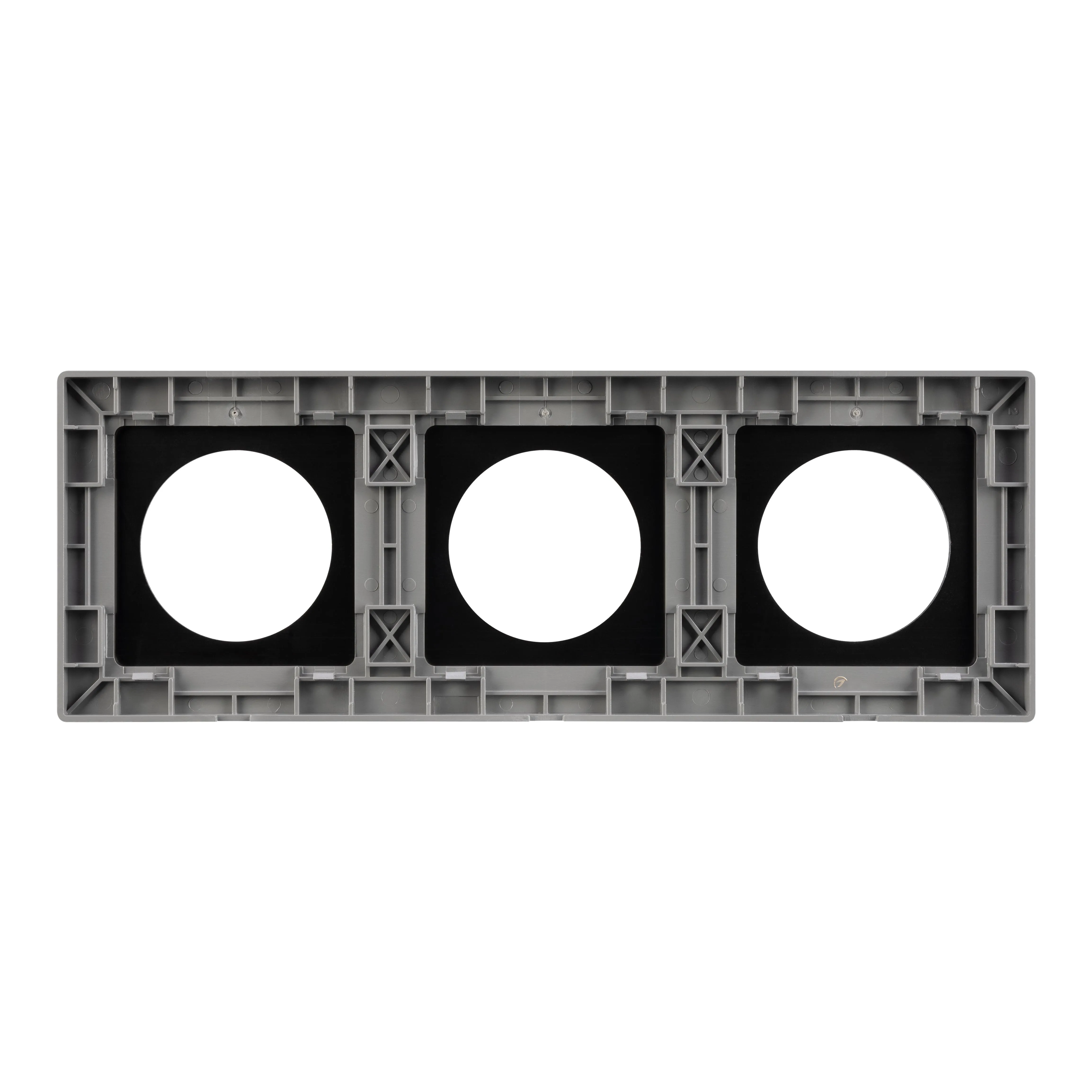 Рамка алюминиевая на 3 поста, под встраиваемый механизм. Вырез под функциональную часть - круг. Цвет - серый. Ориентации монтажа - горизонтальная и вертикальная.