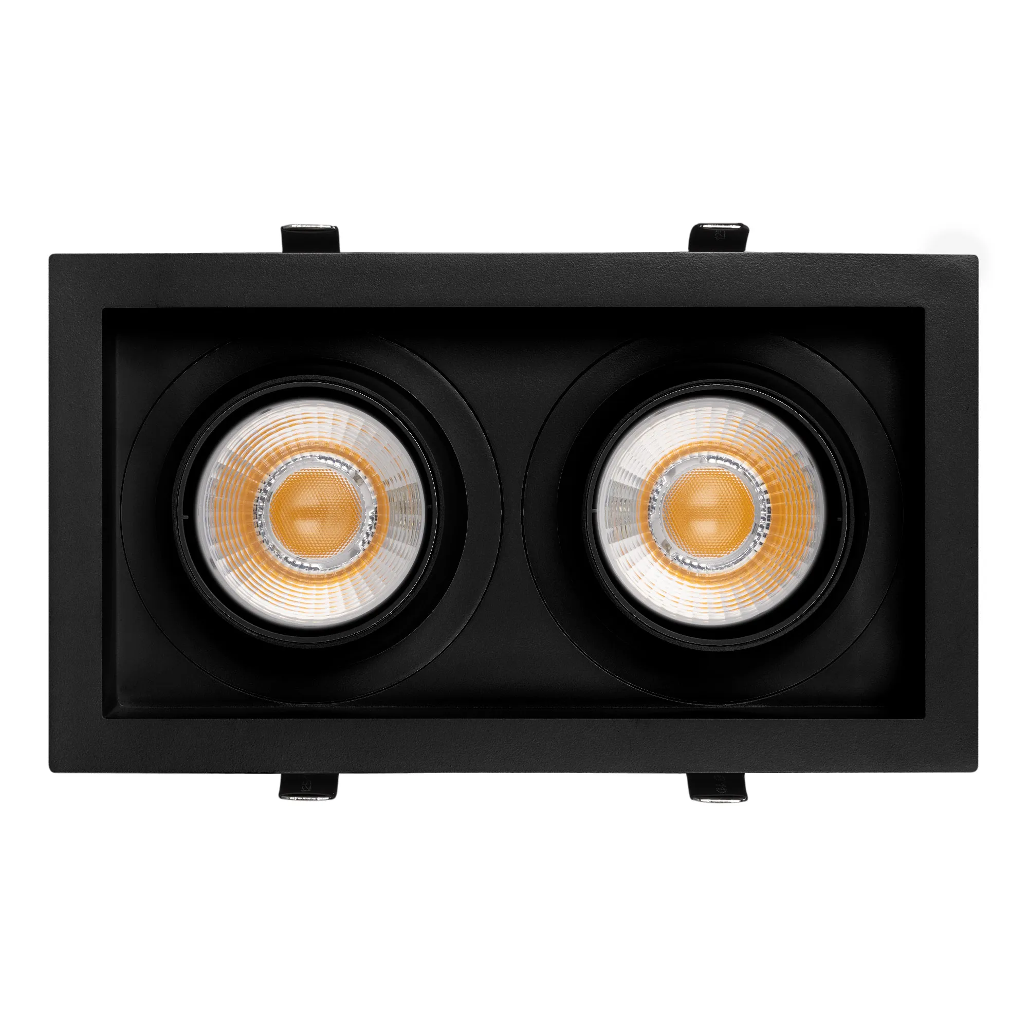Поставка под заказ от 24 шт. Встраиваемый карданный светильник. Мощность 2х30 Вт, св. поток 6520 лм, 108 лм/Вт, тёплый 3000 K, CRI>92, угол 30°, напряжение питания 230 В. Чёрный корпус из алюминия, черная вставка, степень защиты IP20. Размер: длина 250 мм, ширина 140 мм, высота 125 мм. Монтаж встраиваемый, установочное отверстие: длина 230 мм, ширина 120 мм. Драйвер 24-42 В, 750 мА, пульсация <2%.