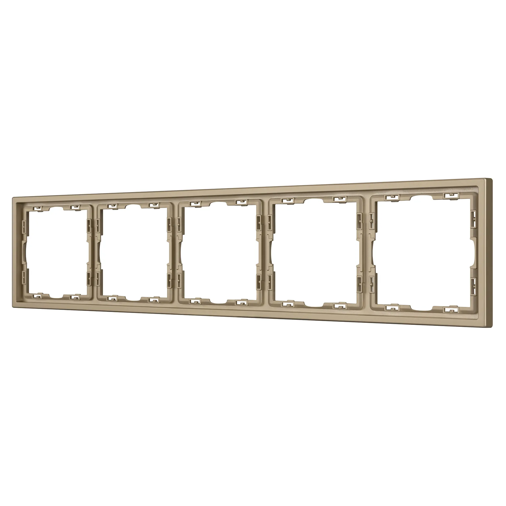 Рамка пластиковая на 5 постов, под встраиваемый механизм. Цвет - золотой песок, с Soft-Touch покрытием. Среднего уровня герметичности IP20. Ориентация монтажа горизонтальная.