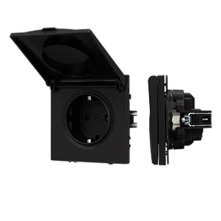 Механизм розетки с заземлением и влагозащитной крышкой на 1 пост. Цвет - черный оникс, с Soft-Touch покрытием. Без фронтальной рамки. Уровень пылевлагозащиты IP44. Розетка устанавливается в стандартный подрозетник круглого сечения диаметром 60мм.