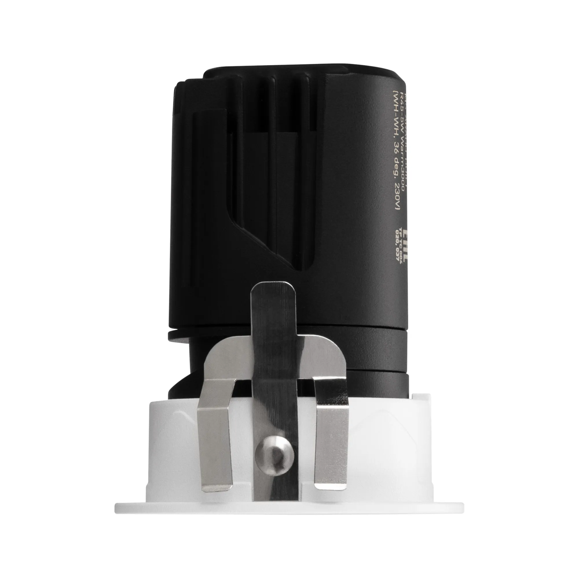 Встраиваемый светильник даунлайт. Мощность 5 Вт, св. поток 280 лм, 56 лм/Вт, теплый 3000 K, CRI>92, угол 36°, напряжение питания 230 В. Белый круглый корпус из алюминия, белый матовый отражатель, степень защиты IP20 . Размер: диаметр 52 мм, высота 66 мм. Монтаж встраиваемый, установочное отверстие: диаметр 45 мм. Драйвер, 27-40 В, 120 мА, пульсация <1%.