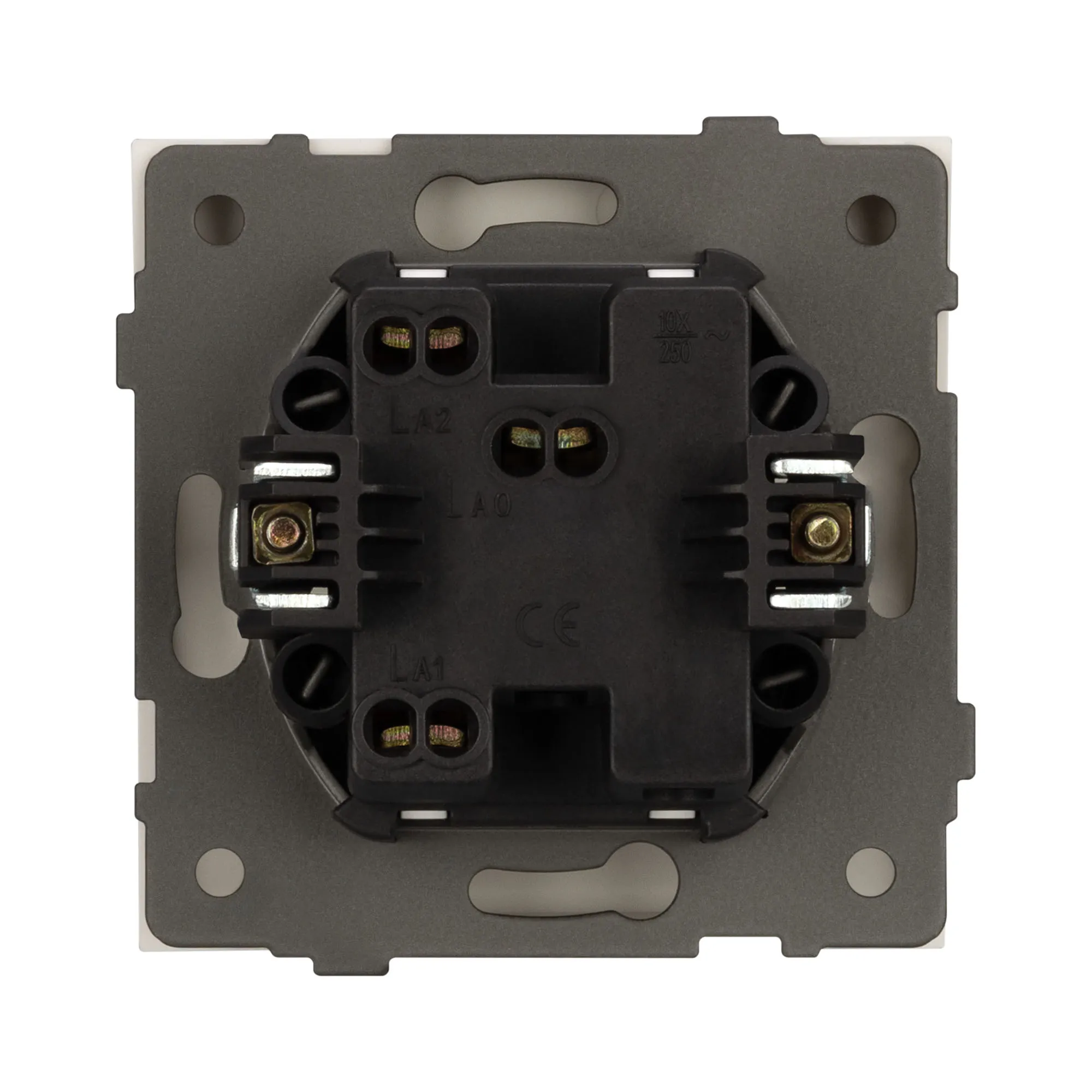 Механизм выключателя света клавишный на 1 пост 1 клавиша (проходной). Цвет - белый, с Soft-Touch покрытием. Без фронтальной рамки. Уровень пылевлагозащиты IP20. Выключатель устанавливается в стандартный подрозетник круглого сечения диаметром 60мм.