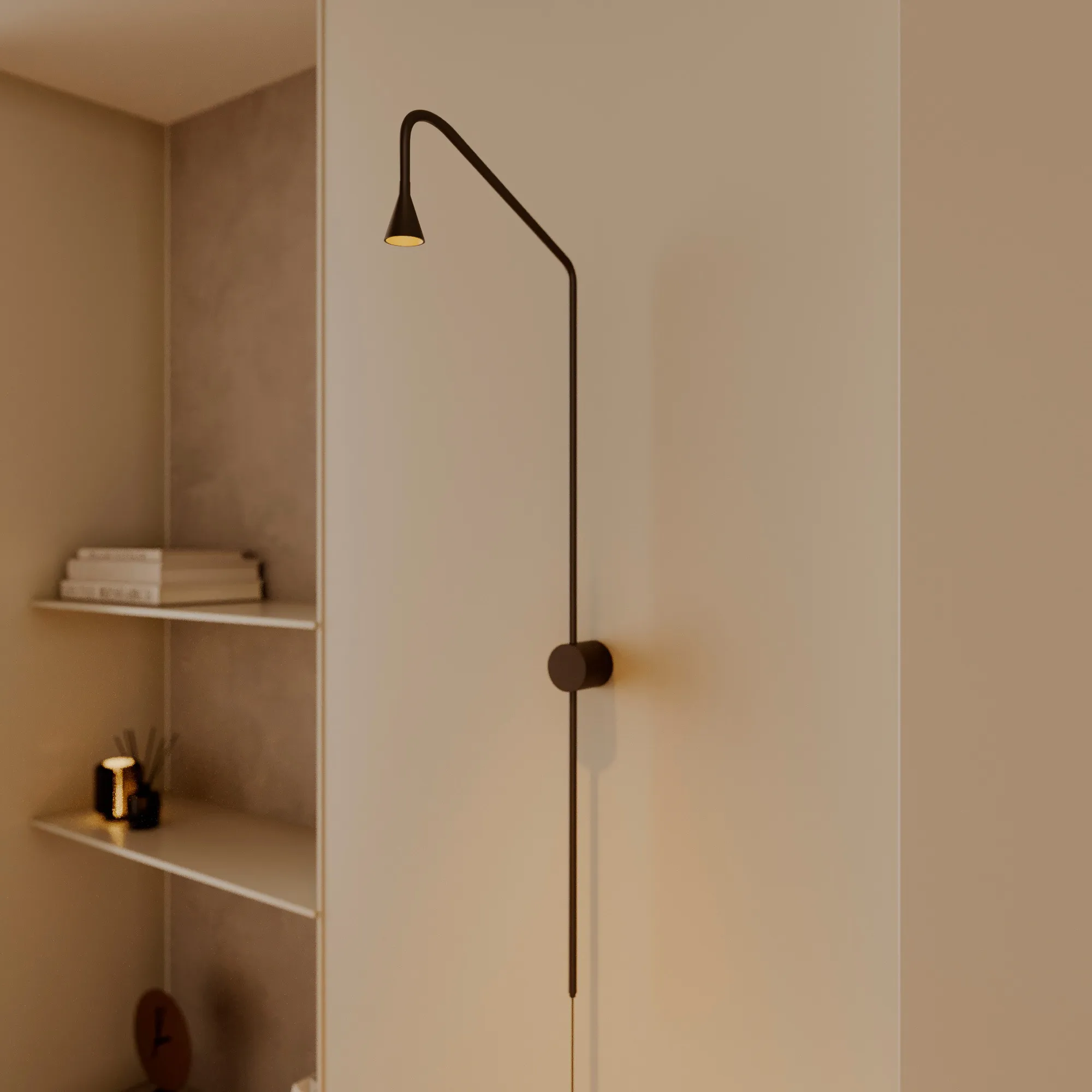 Декоративный настенный светильник. Мощность 5 Вт, св. поток 420 лм, 84 лм/Вт, теплый 3000К, CRI>94, угол 36°, напряжение питания 230 В. Черный корпус из алюминия, степень защиты IP20.Размер настенного крепления 69,5х70мм, диаметр штанги Ø11,4, высота светильника 1200 мм, длина держателя светоизлучателя 420 мм, размер светоизлучателя Ø50×56 мм. Длина провода до выключателя 500 мм, от выключателя к розетке 1500 мм, питание от сети 220-240V. Драйвер 12 В, 750 мА, пульсация <1%.