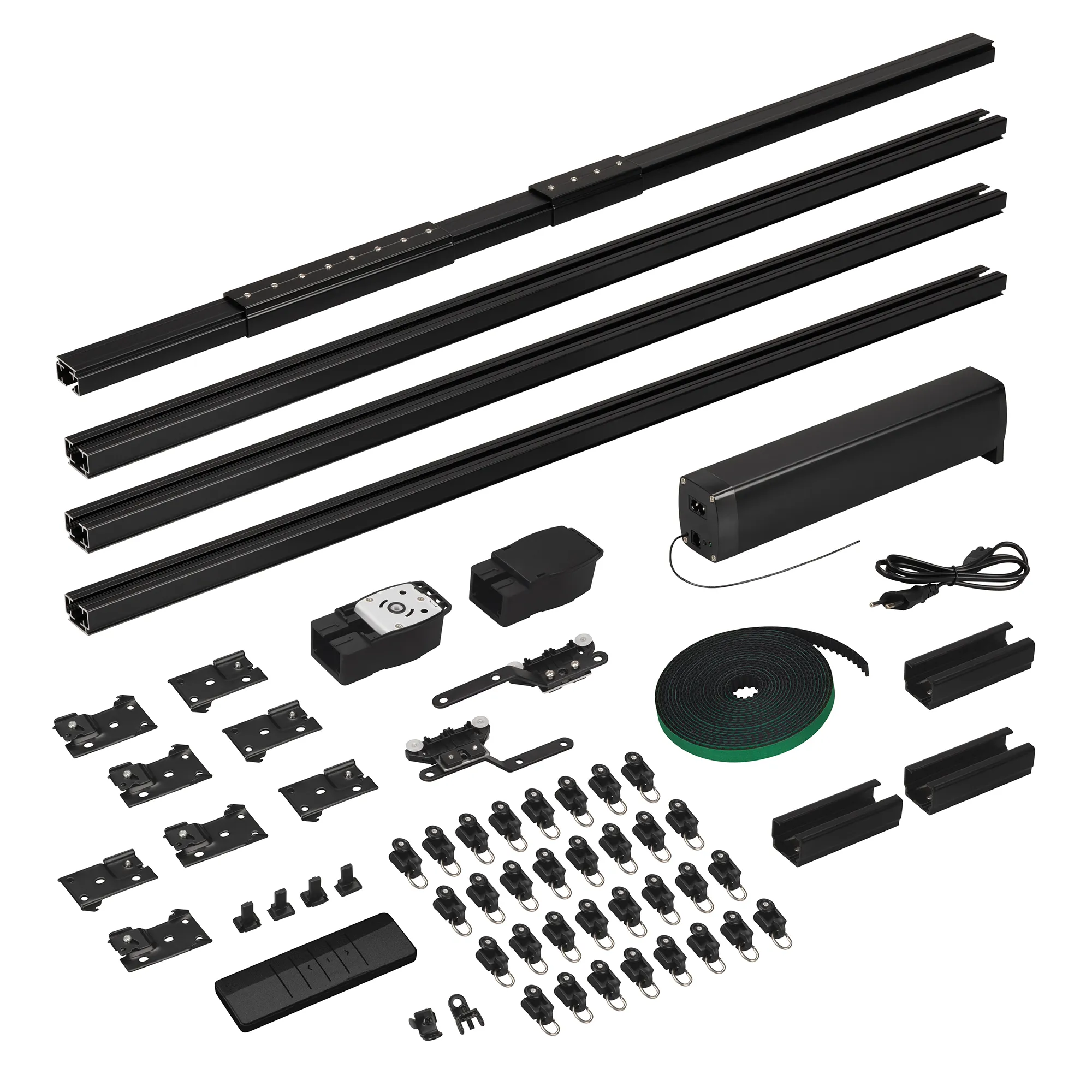 1 мотор, 1 пульт дистанционного управления, алюминиевый профиль 1,6 мм (1м - 3шт, 0.5м - 1шт, 0.2м - 2шт., 0.1м - 1 шт.), 3 соединителя 10 см, 1 соединитель 20 см, 1 переходник 5 см, 2 шкива, 2 пряжки ремня, 2 направляющих бегунка, ремень 8,4 м, 24 бегунка, 2 фиксатора, 8 кронштейнов, 1 зажим на ремень