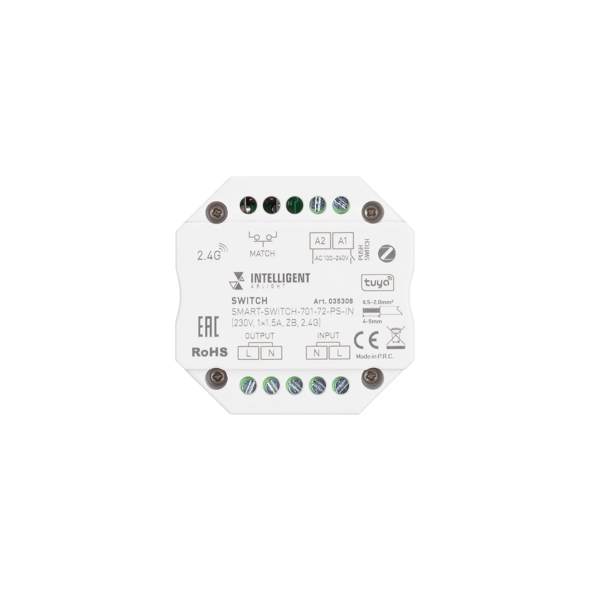 Выключатель для любых видов нагрузки AC 230V. Напряжение питания AC 100-240V, максимальный ток нагрузки 1.5А. Управление 2.4G+WiFi, интерфейс Tuya (через Tuya ZigBee шлюз), поддерживается управление ЯНДЕКС АЛИСА, совместим с приложением INTELLIGENT ARLIGHT. Поддерживает функцию Push-Switch. Габариты 52x52x26 мм. Совместим с пультами и панелями SMART.